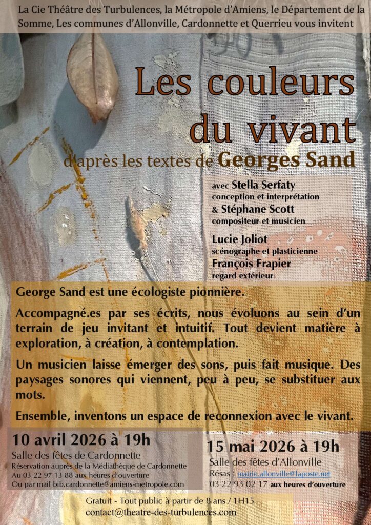 La Cie Théâtre des turbulences en résidence sur notre territoire pour trois ans, grâce au soutien d’Amiens Métropole, à le plaisir de vous proposer deux représentations de « Les couleurs du vivant » inspiré par les textes de Georges Sand :