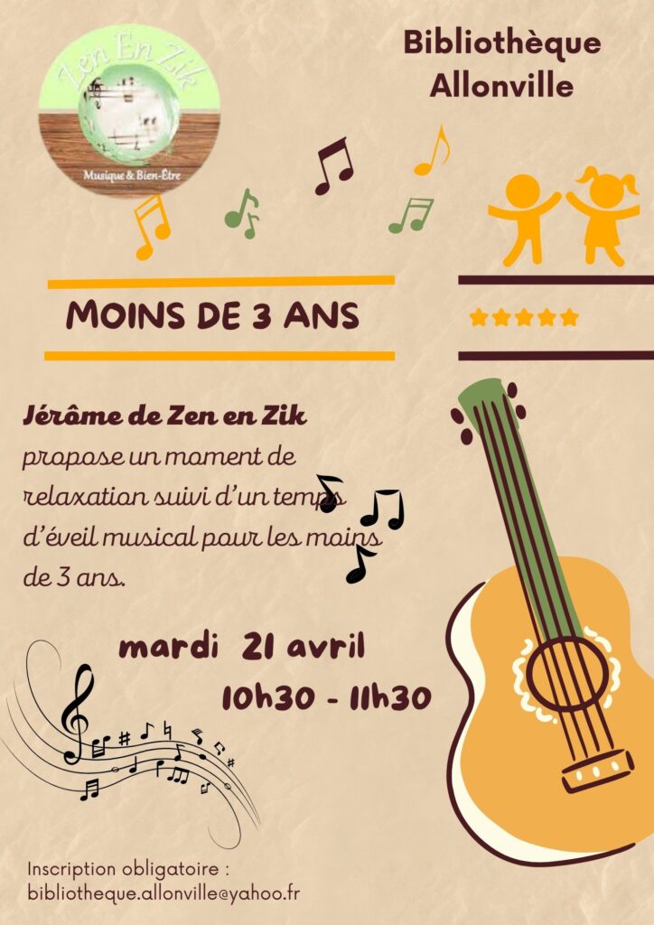 Le 21 avril à 10h30, Zen en Zik, propose aux enfants de moins de 3 ans et leurs parents ou nounou, un moment de relaxation et d’éveil musical.