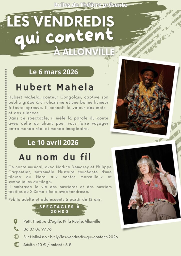 En amont du festival « Ça va conter! » qui aura lieu du vendredi 22 mai au dimanche 24 mai 2026, Bulles de Théâtre vous propose deux vendredis du conte avec Hubert Mahela ce vendredi 6 mars et avec Nadine Demarey et Philippe Carpentier le 10 avril.